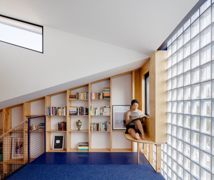 The result is a mixture of wood and plywood that connects the glass-blocked rear of the home to the home’s original exterior. A royal blue hue completes the look throughout, with blue staircases, blue kitchen cabinetry, and blue floors on the upstairs loft space. A massive bookcase spans both the ground and upper level. At night when the lights are turned on, there’s a nice illumination that can be seen through the glass blocks from the backyard.