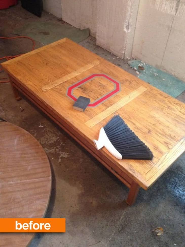 Has this “O” on Beth’s grandma’s coffee table been haunting you, too? If you missed it the first time: Beth wrote in for advice on this hand-me-down table from her grandmother which, unfortunately, passed through a cousin first who emblazoned it with an Ohio State “O” in seemingly indestructible paint. She was desperate for ideas to remove it. Readers encouraged her to sand, sand and then sand some more. Here’s what Beth did…