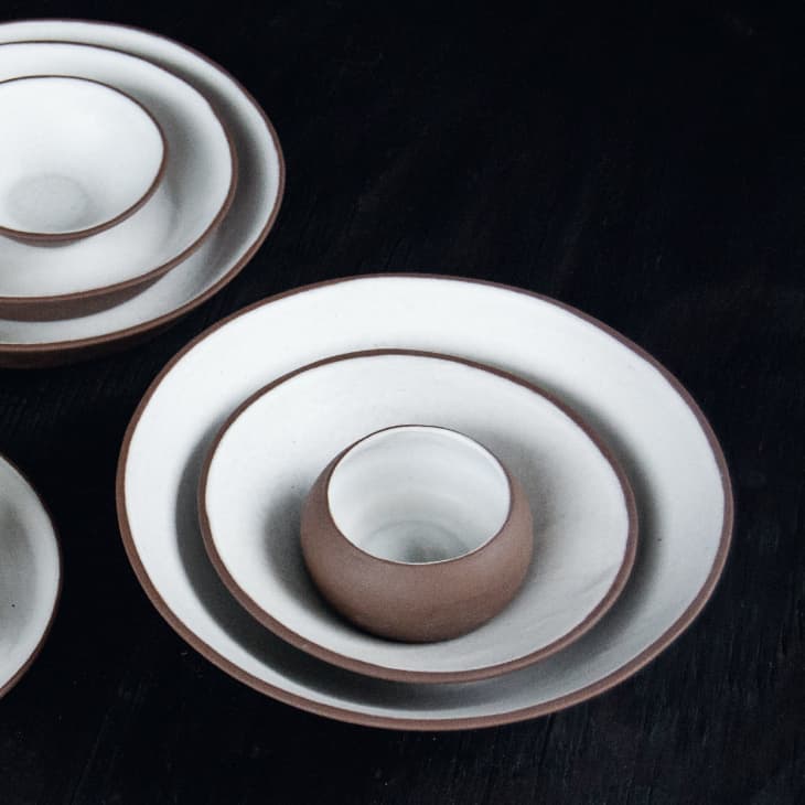 If you’re the sort of person who loves to set a moody, earthy table when the colder months set in, we’ve got an exciting announcement from one of our favorite pottery brands. Right on the heels of the recent re-launch of one of their best-selling glazes, Haand Pottery just announced the arrival of Terra, a two-tone colorway that features a dark brown-red porcelain exterior with a creamy, satin white interior. This new colorway was inspired by historic Roman pottery, and it’s the perfect earthy palette to showcase cozy fall meals. Currently, Terra is available in select pieces, including Haand’s slightly free-form Ripple collection and the more symmetrical Skali collection.