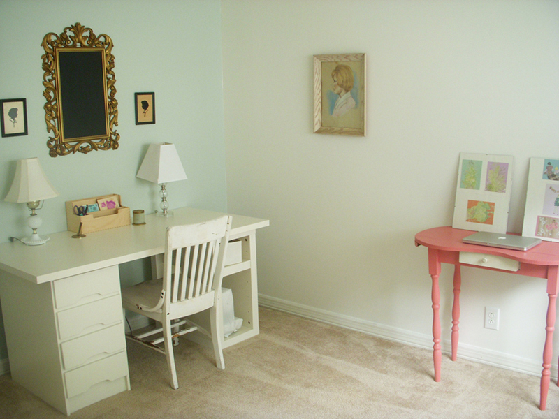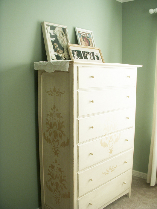 Beds: Family heirlooms, and my husband’s bachelor furniture repainted. (Ugh, someday we will have a grown up bedroom suite)