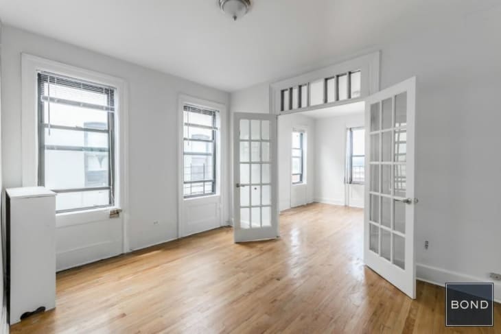 Another HDFC coop, this apartment (also pictured at the top of this post) is L-shaped with tons of natural light, high ceilings, french doors, an eat-in kitchen, and plenty of closet storage. See more photos—and get more info—here.