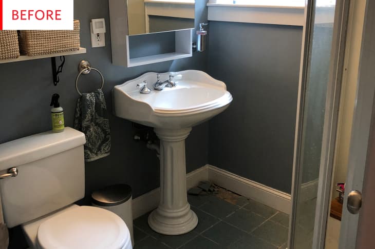 Though this bathroom functioned just fine on paper, it was clearly a bit cramped—that’s the shower stall on the right just inside the door—and, according to its owners, “old, cheap, mismatched, and just plain ugly.” While all the finishes and fixtures look nice enough in the photo, and the palette is cool and understated, photos never tell the whole story. This tiny bathroom is about to get a big upgrade.