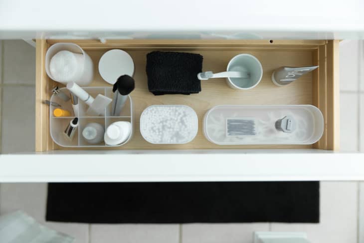 There’s something about the bathroom vanity that yields utter chaos. “To help control the variety of small and large sized items in the bathroom, I use Like-It stackable bricks,” Fisher says. “They’re great in drawers, too.”