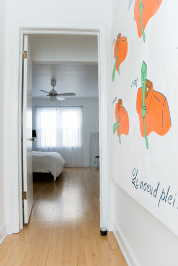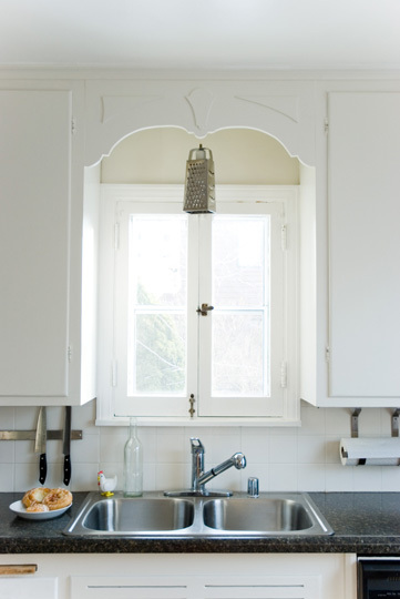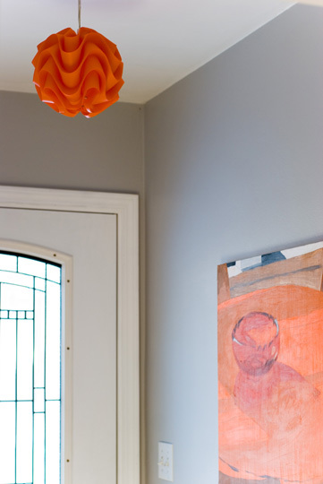 A traditional Cape Cod goes well with a Pottery Barn aesthetic. But this couple delights in modern design and minimalism. The solution is deceptively simple; a restrained but warm color palette is repeated throughout the home, and spare, high quality furnishings are punctuated with personal, whimsical accessories. The many paintings throughout the home are Michael’s work, and the cheese grater-as-lampshade in the kitchen reminds us not to take it all too seriously.