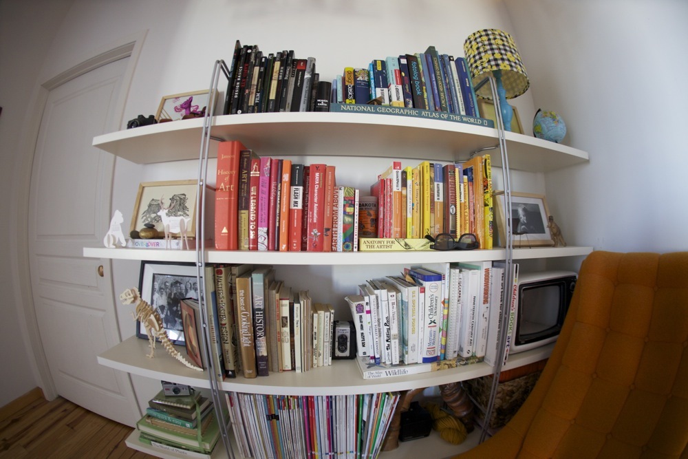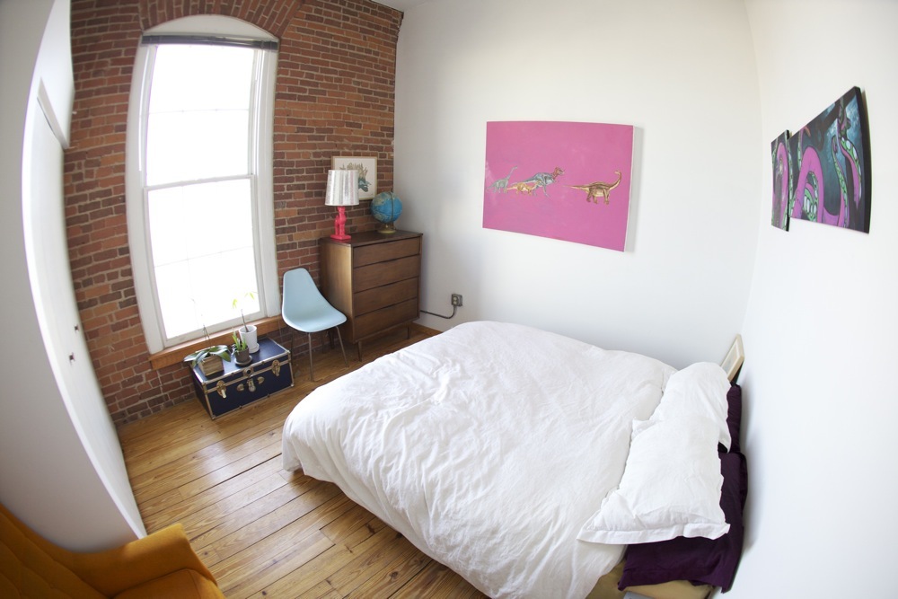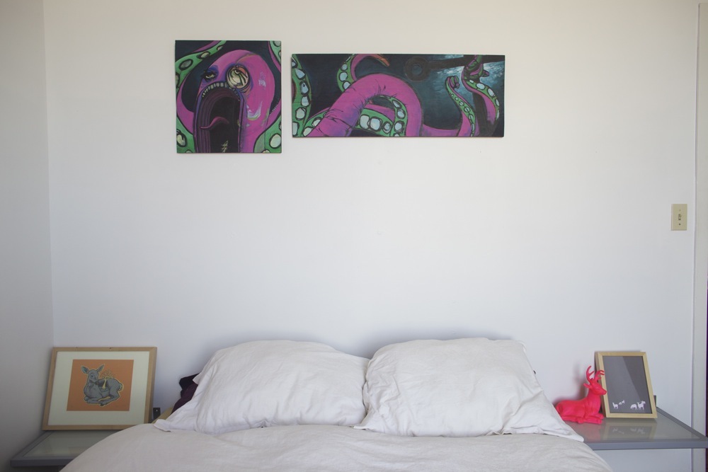 Bedroom: Midcentury Dresser: our parents, hot-pink deer lamp:Urban Outfitters, baby blue knock-off Eames shell chair:Animal Arc thrift store, blue trunk:artist co-op “free pile”, night stands:ikea light-up shelves, dinosaur painting:Stacie original, octopus painting:wedding gift from artist Scott Bergmann, turtle woodblock print: Tugboat printshop