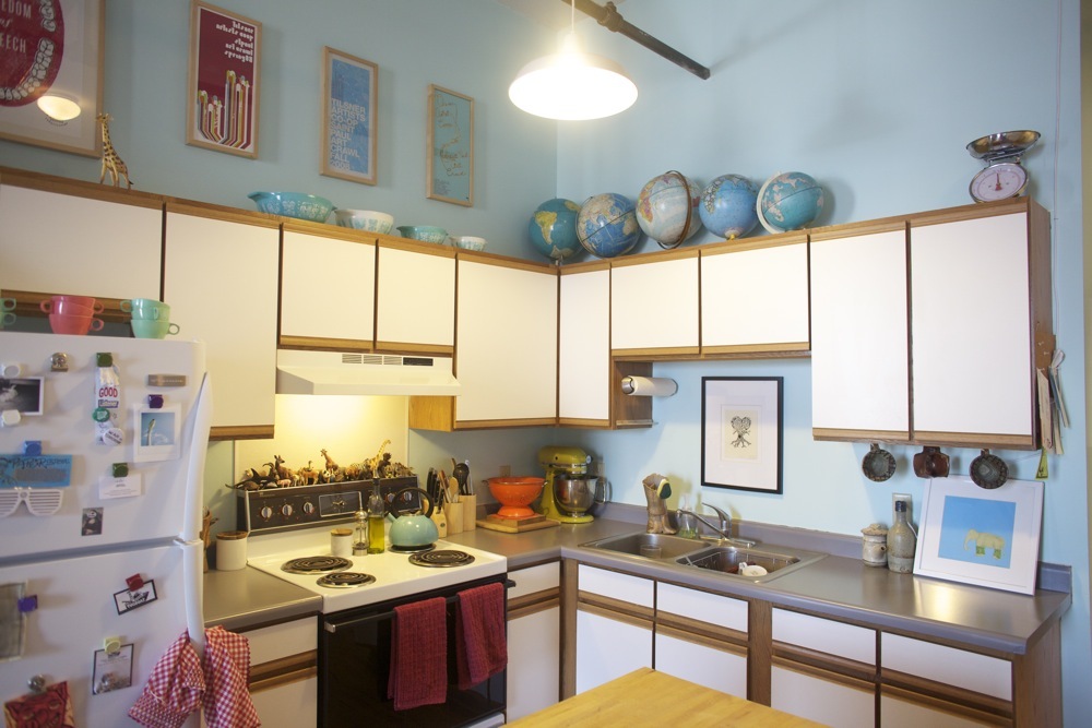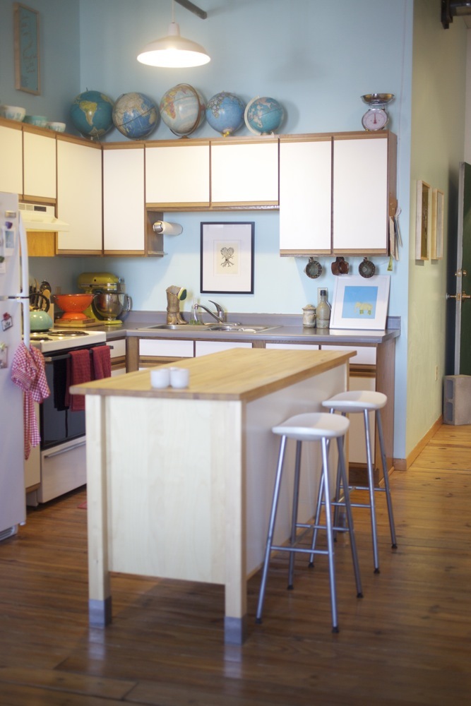 Kitchen: Island and Stools: ikea, Vintage Pyrex, Globes, cups: Thrift stores, Posters: Johnny