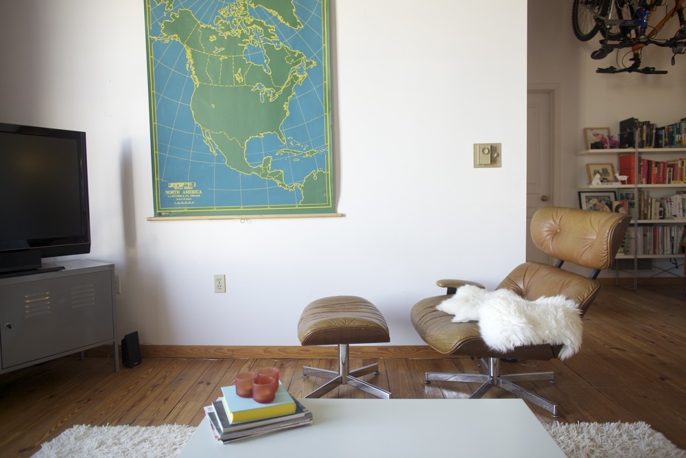 Inspiration: We are very inspired by mid century design and really appreciate the simplicity, materials, and functional beauty of that era. We love and are heavily influenced by color; and, as you can see from our apartment, are not afraid to use bold, bright colors in our space. We live in an artist cooperative, and believe that artists and all forms of art are a huge source of inspiration. We like collecting, creating, and living with handmade art and craft and having some sort of connection with the artist is even better.