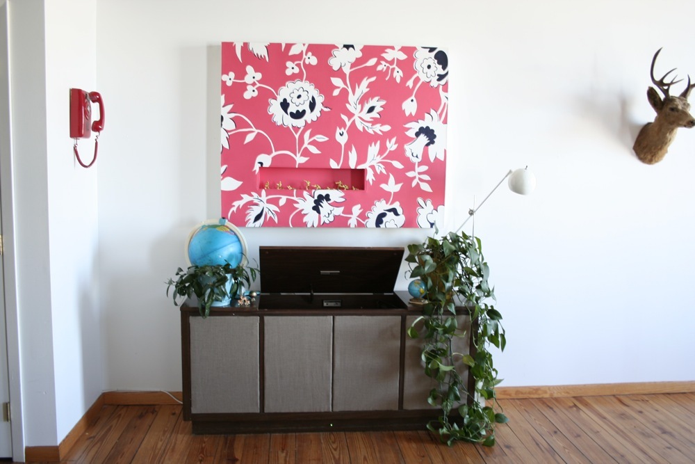 Dining area: Stut X-Large Table: Blu Bot, Eames Shell Chairs: University of Minnesota Reuse Center, Deer Art: Johnny, Ceramics & Flower Painting: Stacie, Zenith console record player and radio: Craiglist, red rotary phone: art co-op “free pile”