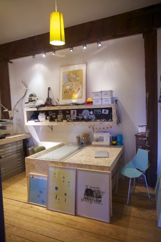 Proudest DIY: Johnny built and designed the partner desks/screen-printing unit, shelf, and countertop in our art studio. It was incredibly cheap too because it’s made from chip board!