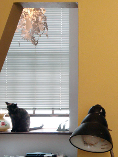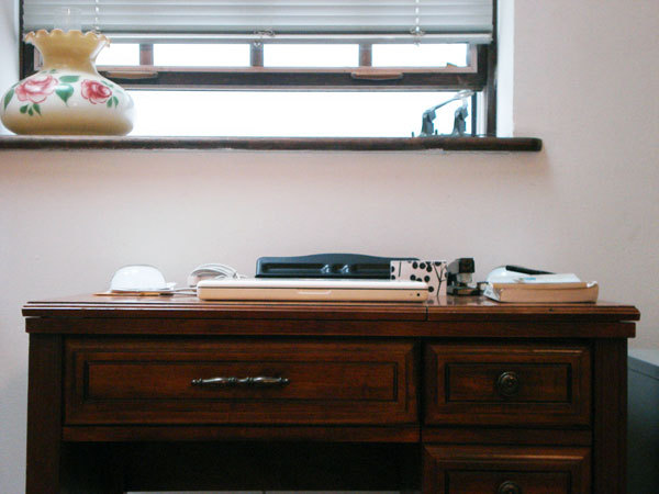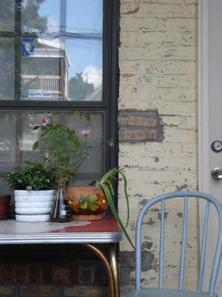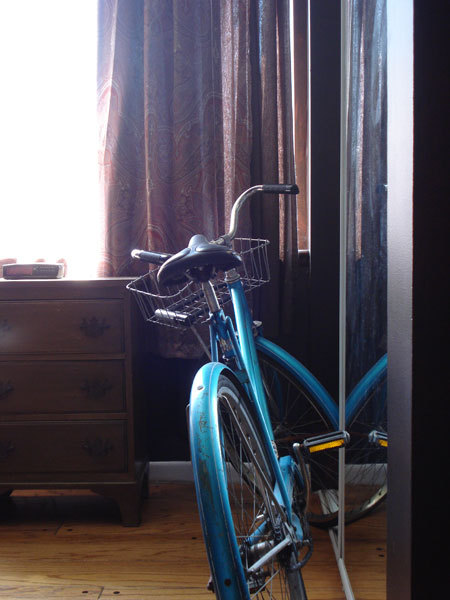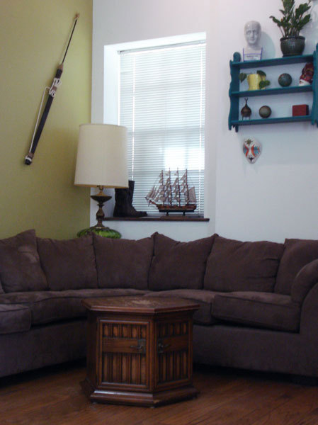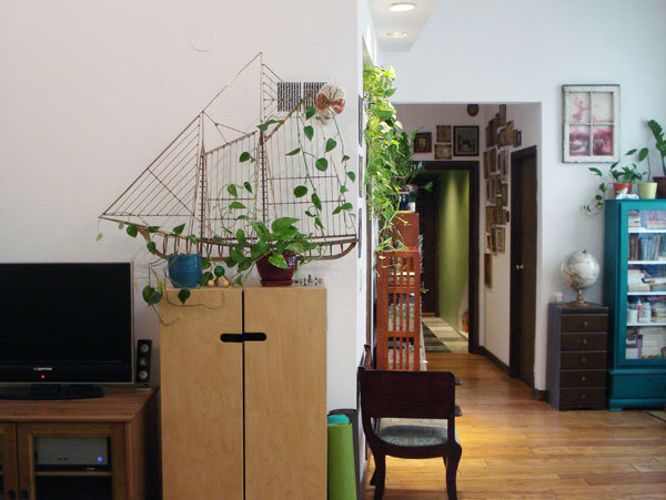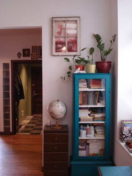 In the living room, the sectional couch is from Home Dream Furniture, a dive furniture store on the North Side that went out of business soon after our purchase. The television stand is from Ikea. Our large metal ship is a trash salvage, compliments of our neighbors to the west. The larger of the two green lamps was a gift given to B’s grandmother from her uncle, and has since been passed down to her; the smaller was a lucky thrift find. The wood ship statue is from an antique store in central Illinois, purchased by former roommate Matt. Window boots by Frye. The turquoise case is a former gun cabinet from B’s house growing up, converted into an art supply cabinet. Of the two sewing tables converted into desks, the table on the lower level belonged to B’s grandmother and the table on the upper level was from our neighbor’s trash.