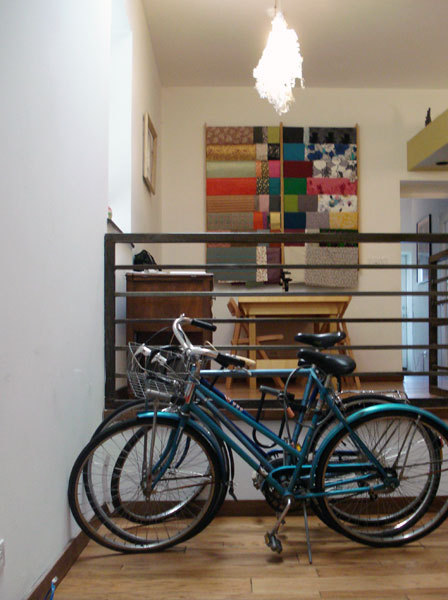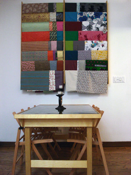 Dave Ksander – dksander(at)gmail(dot)com – built the dining room table (can be easily disassembled and moved, no screws or tools necessary), and built (with B’s help) the paper and textile racks, as well as the back pressure-fit wall. He can be contacted for people interested in his carpentry work.