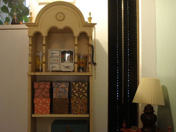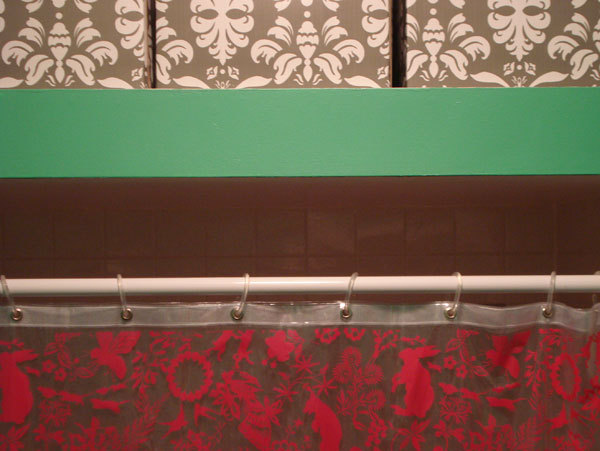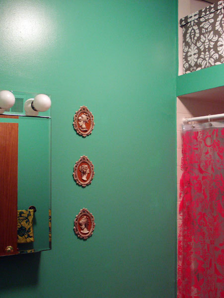 The shower curtain is from Urban Outfitters, boxes from Ikea, and the 3 cameos are a kitschy thrift find.