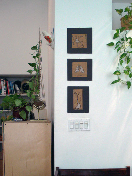 Embroidered art pieces “Digestion, Lungs, & Nerve Cells” by Dee Clements/Paper Crane.