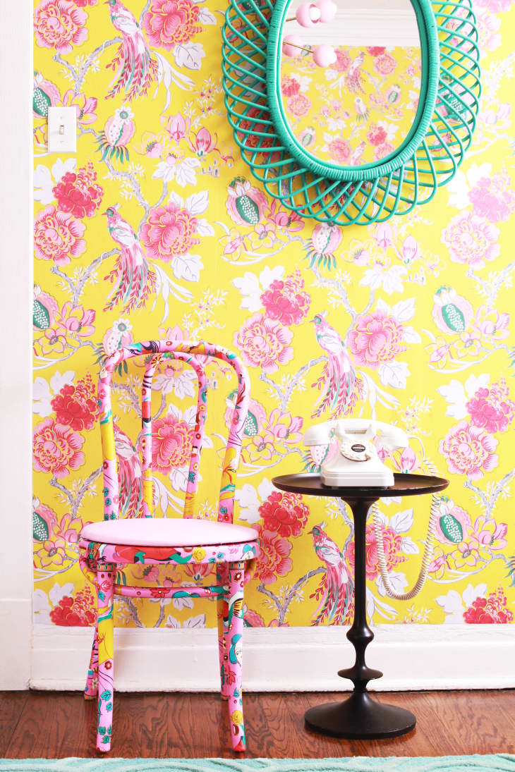 Paint is a go-to for refinishing old furniture, but it’s not your only option! For a fresh spin on your old stuff, why not try decoupage? Yes, decoupage—the stuff eighth-grade me used to shellack Devon Sawa’s face to every surface of her room. I guess I always knew decoupage was created for more than crafty teens with subscriptions to Tiger Beat, but hadn’t seen anything projects I’d wanted to try until recently, when I came across this decoupaged bentwood chair by Camila Pavone of Effortless Style. I had a bentwood chair of my own that needed a refresher, plus some fun fabric, so I ordered a tub of Mod Podge and created my own statement chair. It wasn’t difficult, but I do have some tips to help make your project a success!