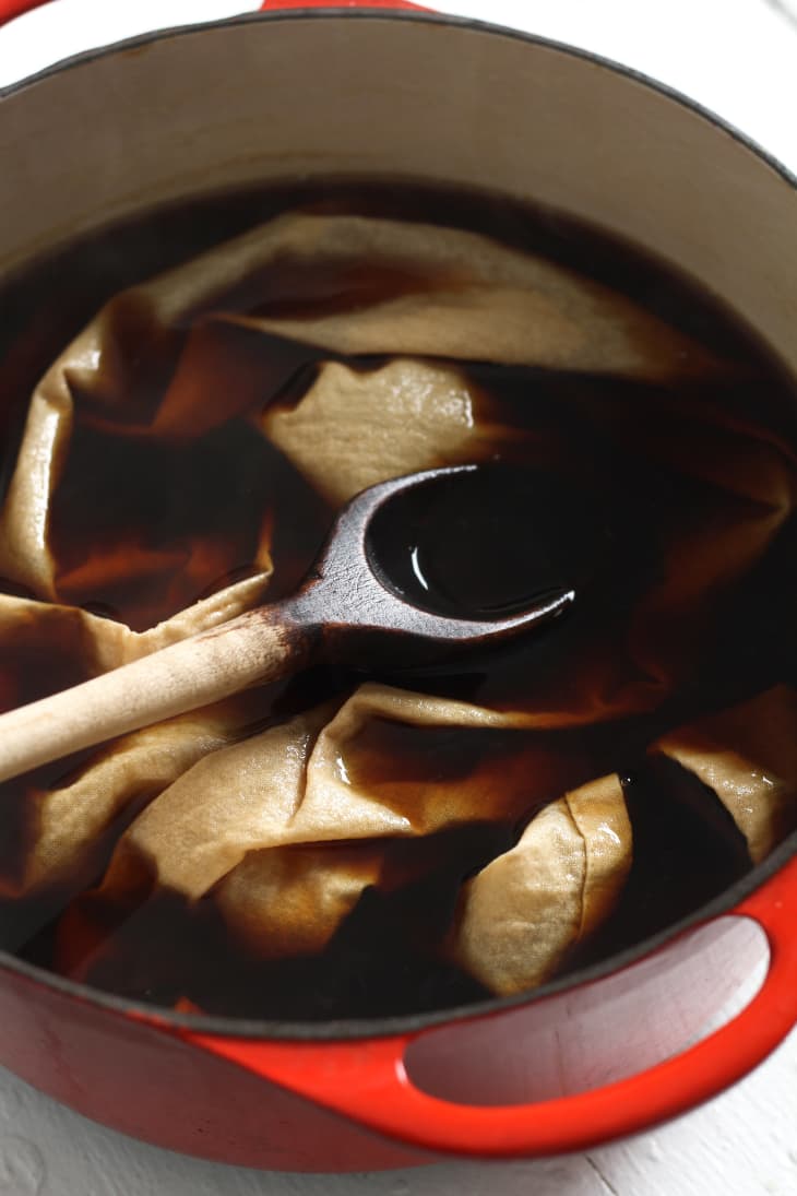 Step 2: Turn off the heat and insert the damp cloth into the brew of your choice. Swirl the cloth around and try to get it down to the bottom of the pan so that it’s completely submerged. If pieces start popping up, use extra kitchen utensils to hold them under.