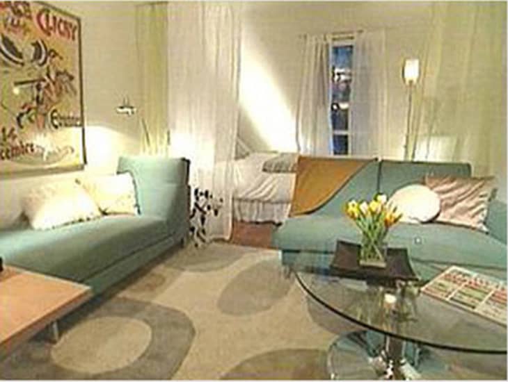The pic at top is from an apartment we did for HGTV last year. You can see the one room studio is divided by long curtains that came from Anthropology. They separate the bedroom without cramping the space…