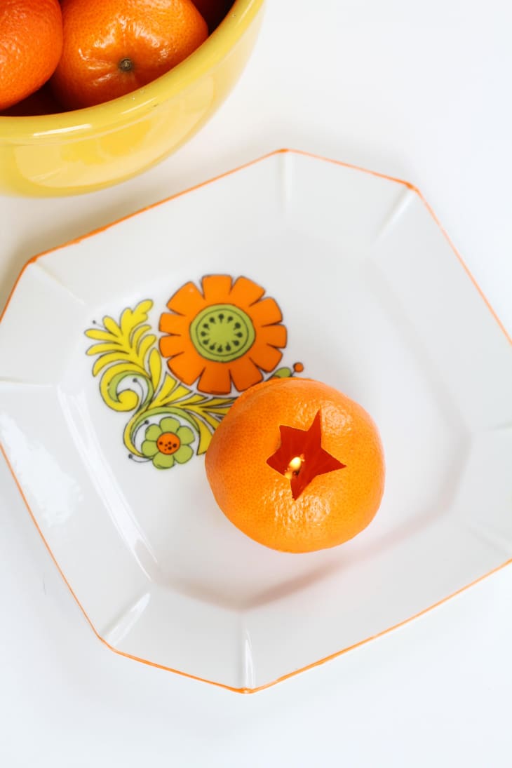 NOTE: The tough part is getting the “wick” to light. You really need a nice bit of clementine “flesh” sticking up in the middle, which you then soak for a minute in the olive oil. If your clementine doesn’t have any flesh in the middle OR if you rip it, you’ll need to start with another one.