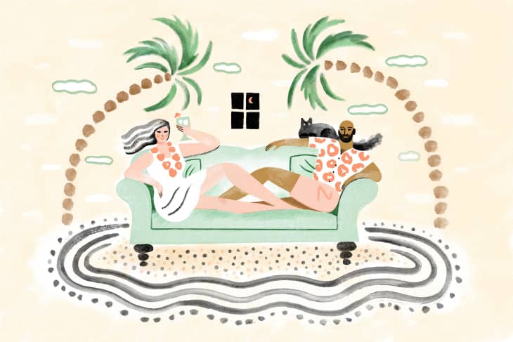 “If you are homey-mooning in the Caribbean, for example, consider draping out the room or ceiling with hot-colored fabrics in pink, lime green, and yellow,” says Boston-based event planner Janie Haas of Janie Haas Events. Want to go really big? “Rented—or fake—palms strung with fairy lights will create a tropical ambiance, as will a small table set for two with splashy linens.” Got a bathtub? Fill it with blue bath salts to mimic the Caribbean ocean, Haas suggests.