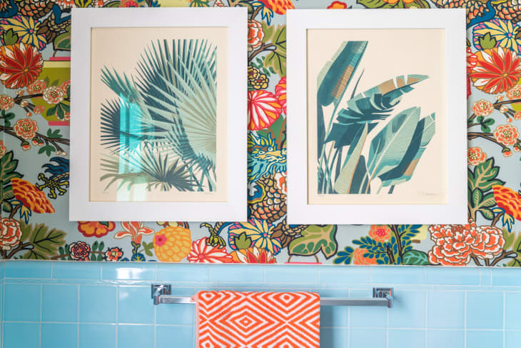 The peach and mint tile color palette seen in this Austin home looks like an intentional design choice, rather than just something the renters were stuck with, thanks to a cool modern art print that contains the colors found in the tile. The renters got pretty lucky when they stumbled on an art piece that matched their bathroom so perfectly, but you could always DIY a piece of art if you can’t find something to buy.