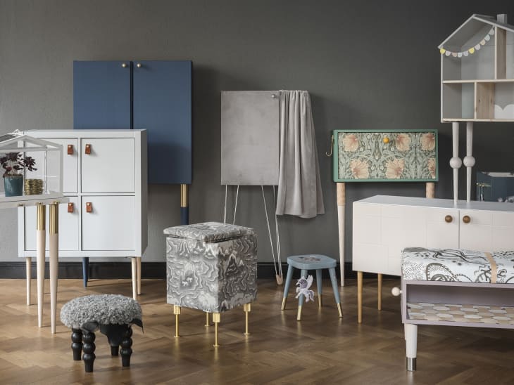 Here, designer Alva Fierro turned the IKEA IVAR into something more dramatic and stately by adding tapered table legs with brass accents and a fresh coat of matte paint.