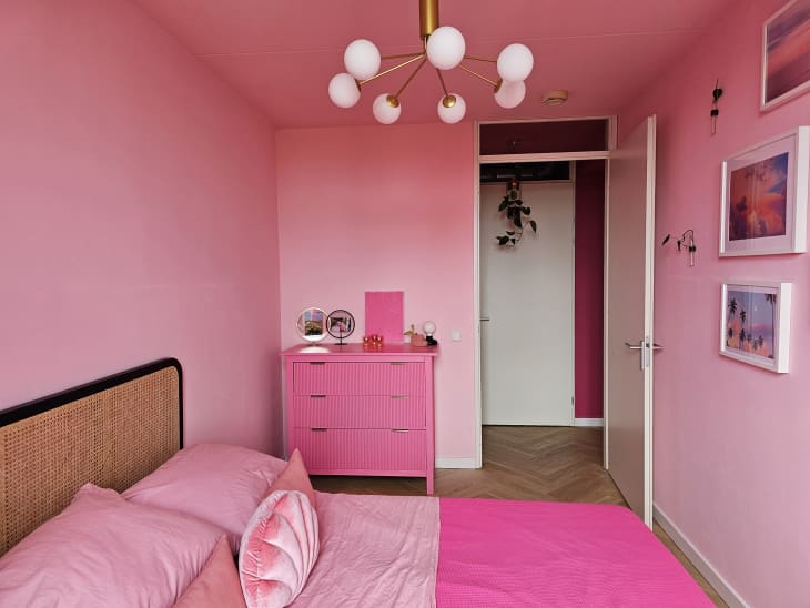 So, when I came across Rian’s hot pink apartment in The Netherlands, I immediately swooned. Painting a room in all one color (just check out these pink bedrooms) is such a bold choice, but an entire home? Now, that’s commitment. But what really impressed me was how Rian took it a step further: painting some of her furniture to match the vibe, too.