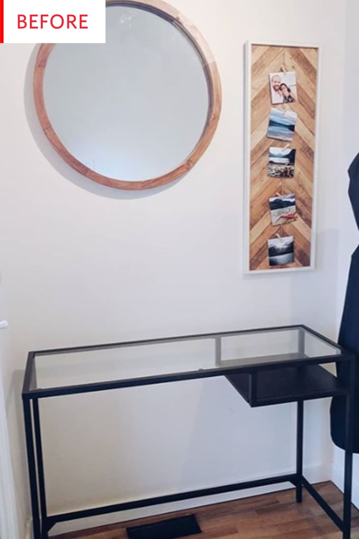 This entryway had a spot for coats, a large landing strip, a mirror for last looks, personality, and beauty, but it was lacking in storage for shoes and other odds-and-ends. A DIYer who enjoys “trying to figure out how to make things with no experience” solved the issue with a few ordinary IKEA drawers and some very special wood.