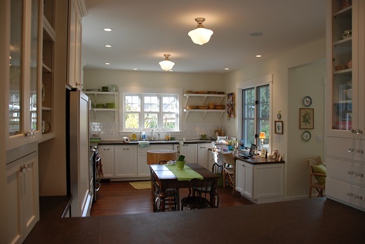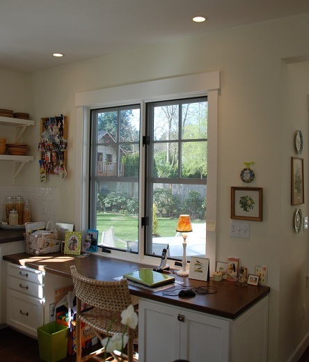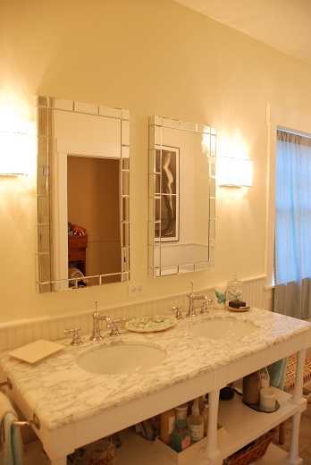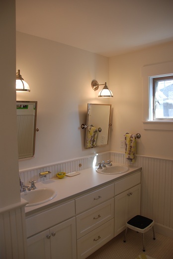 Joni and Eric love their neighborhood and designed their home for their current and future lifestyle. The girl’s bathroom was plumbed for a stackable washer dryer so that as they get older they can do their own laundry and peg boards help organize the space (now it’s bath toys, later it will be laundry supplies). The mirrors above the kids’ sinks tilt so the girls can see themselves no matter what their height. The traditionally unused area under the stairs was fitted with pegboard for hanging coats at various heights and was also carpeted – knowing that this is the most coveted spot when you are little and looking for a secret hideout. The mudroom/laundry room is also fitted with rows of pegs of varying diameters to hold house keys, leashes, coats of all sizes and canvas bags for toting everything. The washer and dryer is hidden behind a curtain and an oversized laminate counter is a great spot for all the items that are frequently brought in and out of the house (and is also home to their pet guinea pig, Flopsie, and cat, Whitie). In the kitchen she chose pretty glass cabinet pulls for the “formal” entertaining side and stainless steel pulls for the “working” side of the kitchen. The kitchen boasts a great span of workspace for Joni, who from her seat can view the front yard and the back, and the surface can be easily cleared off to make room for family feasts.