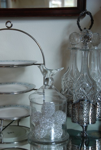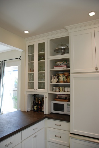 Pretty glass drawer pulls in the entertaining area of the kitchen