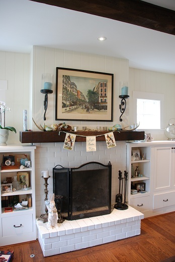 Joni is a fan of pretty packaging and decants ordinary items, like laundry soap, into glass bottles and jars. This attention to detail makes each room, no matter how utilitarian, beautiful. She is inspired by the beach and birds and both of these elements make a special appearance in all the rooms. Joni was very hands-on when it came to building and installing the pieces in her home. For example, she wanted small, flat stones for her bathroom flooring but couldn’t find the correct color. So she took white stones, tea-stained and colored them with ink to create the desired shade. Joni and Eric wanted traditional wooden beams in their living room to create a cozier environment and found reclaimed beams that invoked that vintage feel. “We’re hard on our home,” says Joni, explaining the need to have good solid materials in her home. Durable honed granite counters, the color of concrete, mixes with sturdy subway tile and hand-scraped hardwood floors. Wipeable white-washed bead board compliments laminate counters in the kids’ bathroom and laundry room. But all of this sturdiness balances the more feminine, delicate pieces in the home.