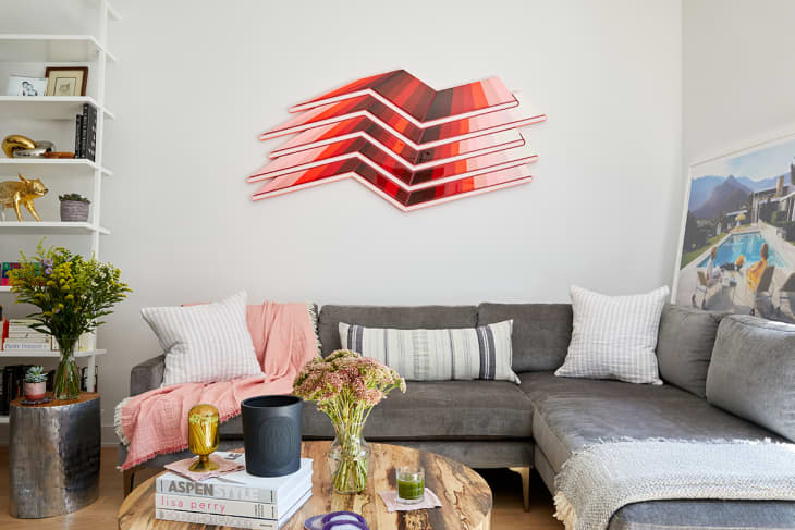 When it comes to interiors, Sands prefers to keep her bigger pieces more muted and neutral, letting the pops of color come from things like books, decorative objects, textiles, and art. So she rented a gray sofa (she’s tried both a sectional and the three-seater pictured just above) and accent chair as well as a wooden circular coffee table to anchor her living room area, which lets the tonal Jenna Krypell wall sculpture above her sofa — curated by her mom, art advisor Ilene Sands — shine. “The art has really breathed a lot of life into the apartment,” she says. The Krypell piece also creates a literal eye-path toward her pair of white CB2 shelves, where she’s colorized her favorite reads by the spines and added things like pottery and travel souvenirs to give the space extra personality and pop, in addition to linens from companies like Kassatex.