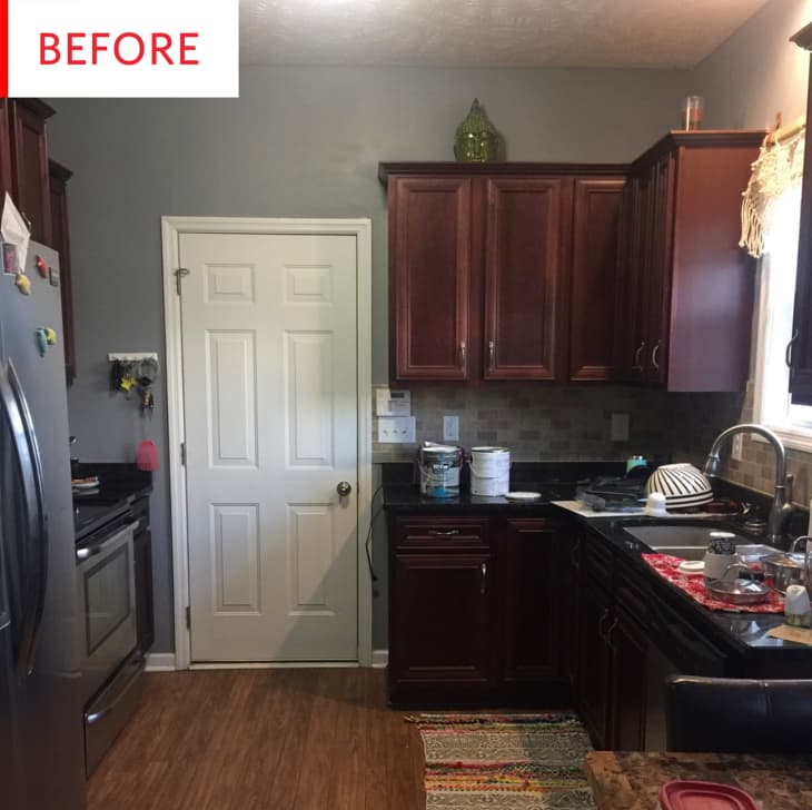 My kitchen was very dark and traditional before. Our cabinets were a dark cherry wood. The mix of dark cabinets and dark floor just made the room feel so small.
