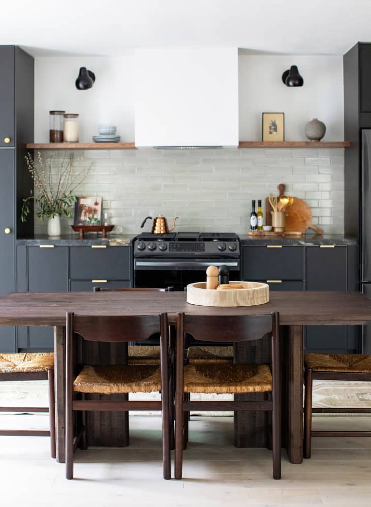 Like with most things, a few tricks can help you pull off this design decision with finesse. First, make sure you opt for a sturdy table design that can hold up to daily prep work and dining, even if it’s vintage. Second, the more your table looks like your cabinetry — or ties into an element already in your kitchen (like the open shelving in Sage’s project, for example) — the more this layout trick will read as an “island” visually.