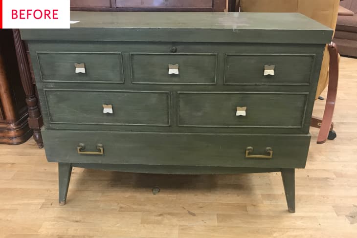 When Nicole Goodreau and her fiancé spotted this mid-century Lane cedar chest at their local Goodwill for $30, they knew they had to have it. While the existing army green color and retro knobs didn’t fit their home’s modern aesthetic, they were confident that, with a little elbow grease, they could transform it into the perfect storage piece for their petite city apartment.