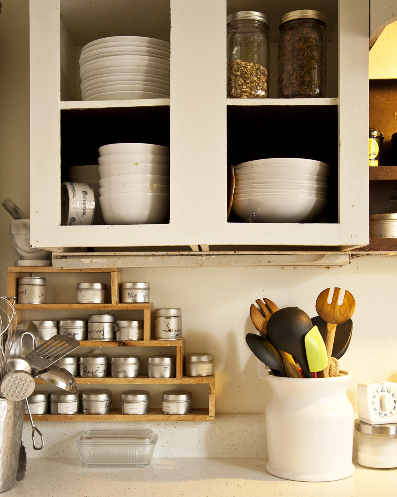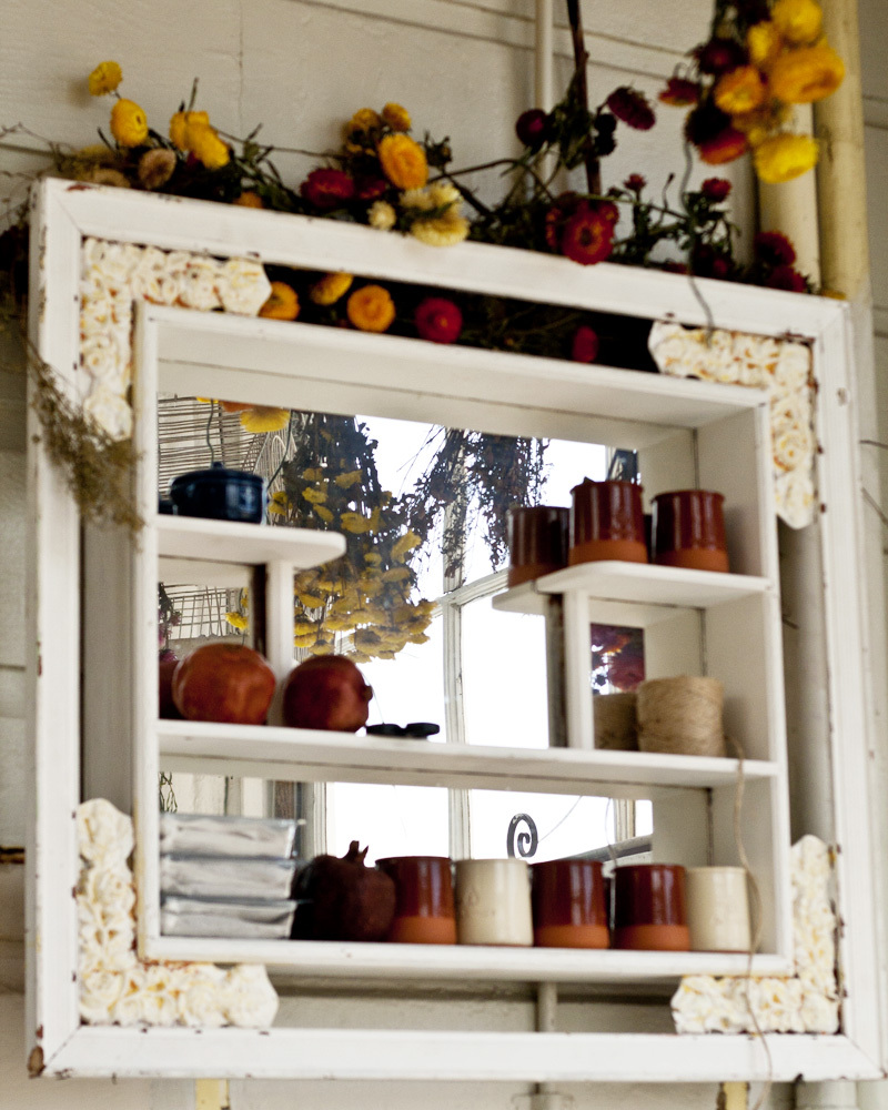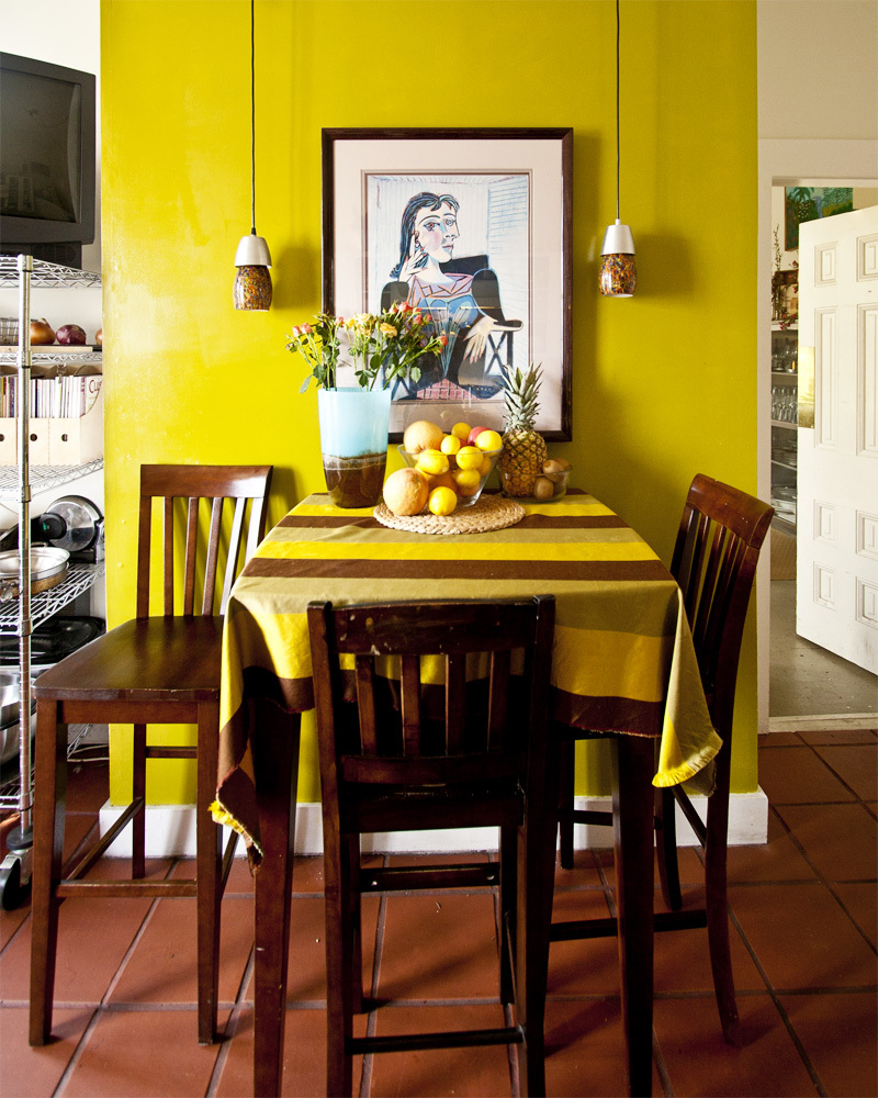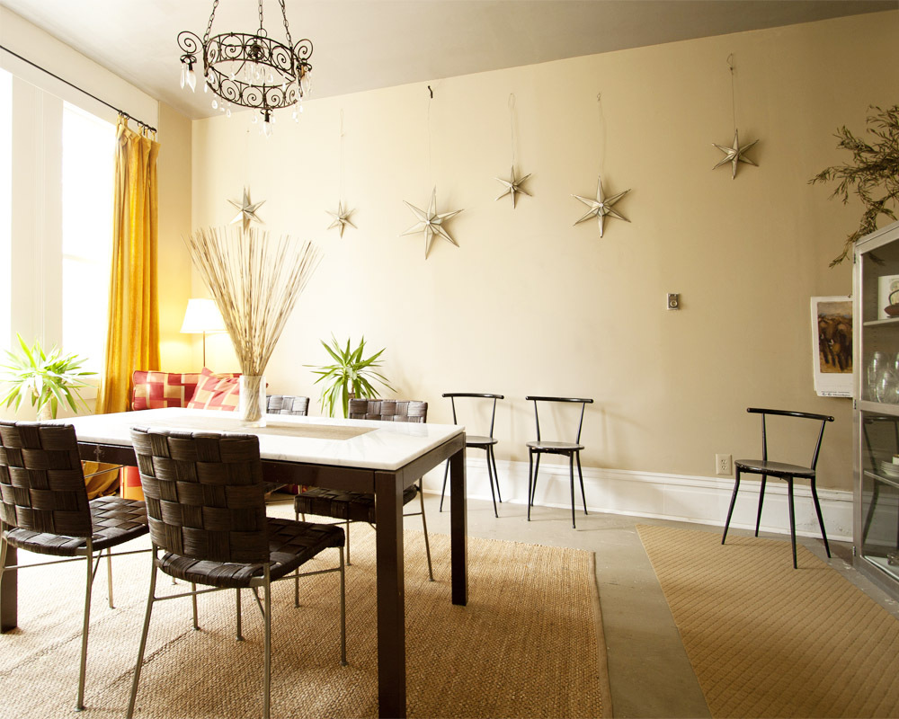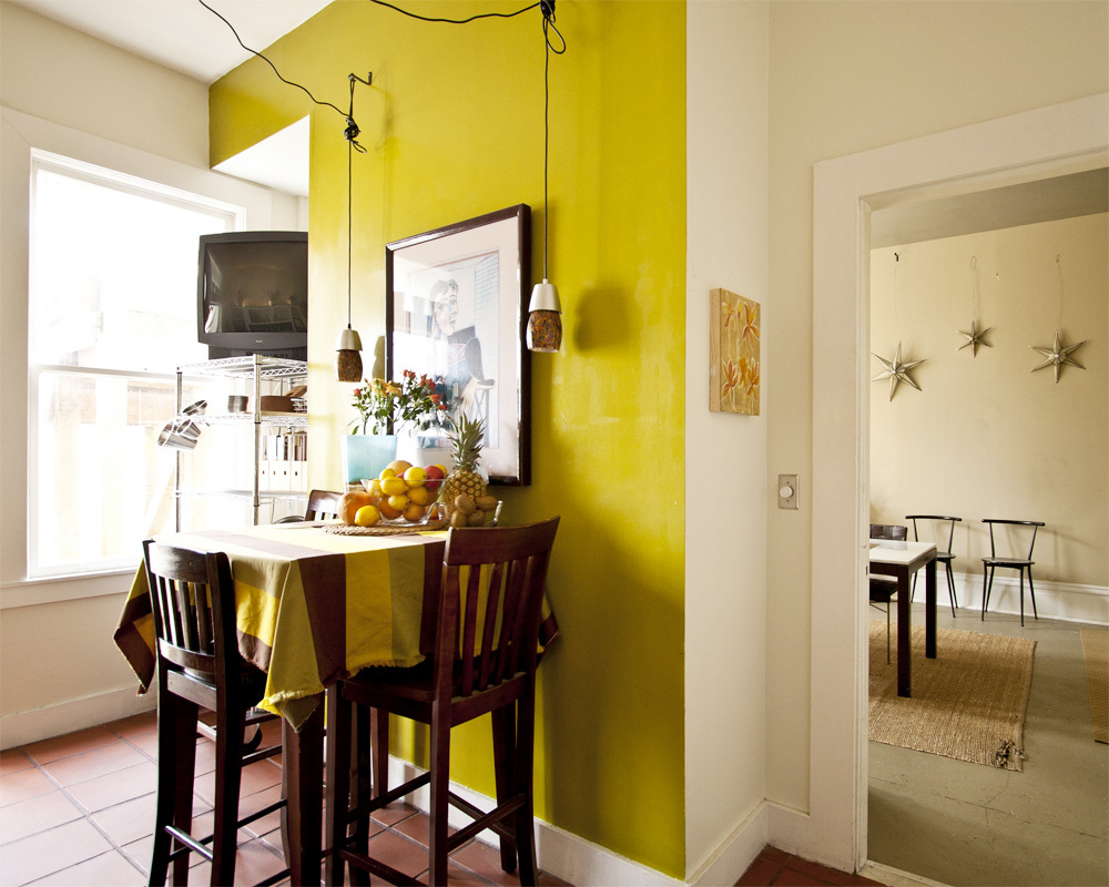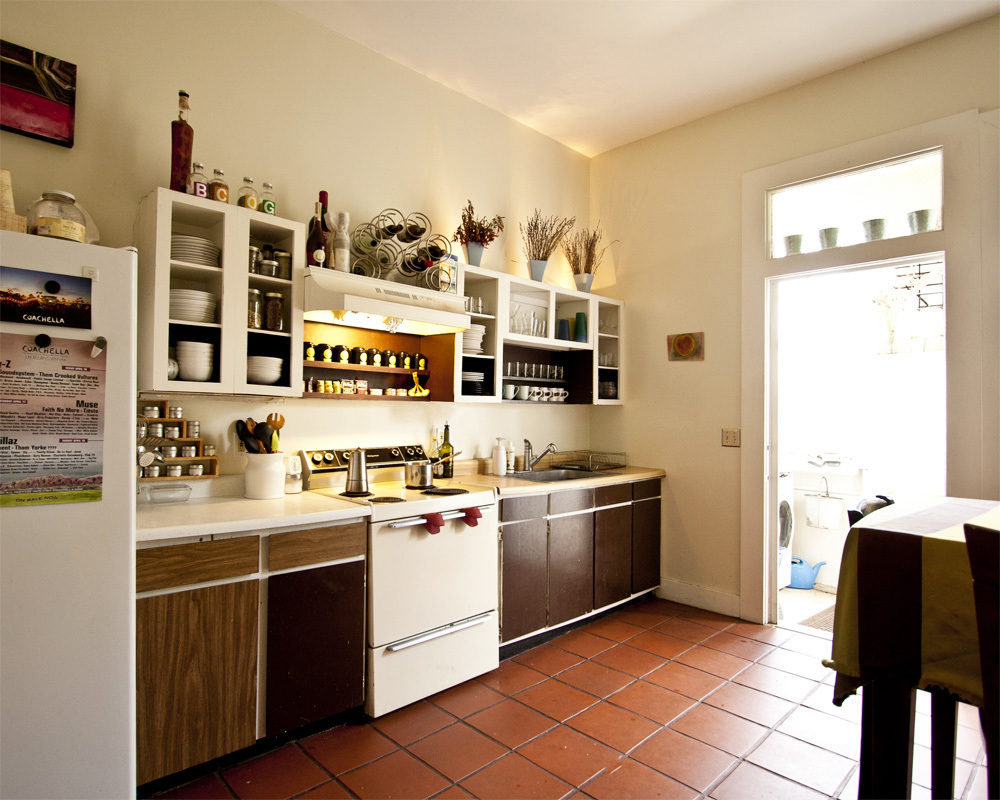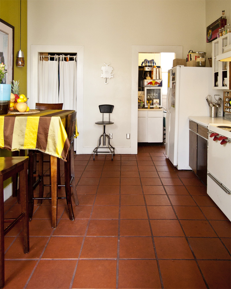Lanz’s role as “head stylist” continues throughout the dining room, kitchen and sun room / laundry room. From the collection of chairs and wine boxes in the dining room to one of the cheeriest little laundry rooms we’ve encountered, the roommates continue to be resourceful in their quest to decorate their 4,000 square foot home.
