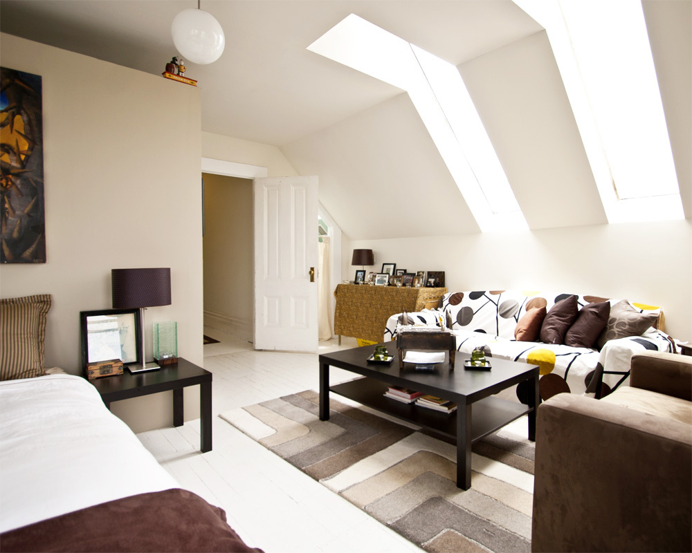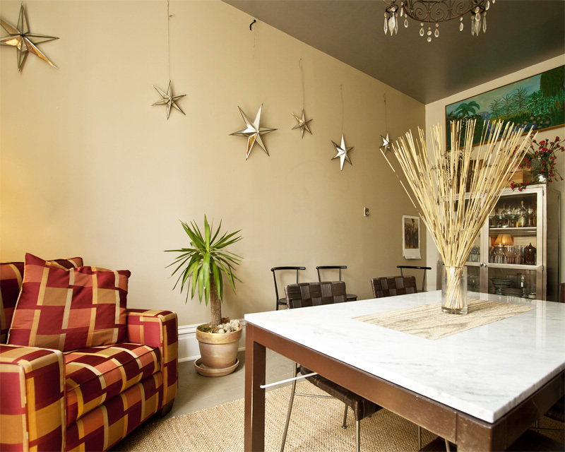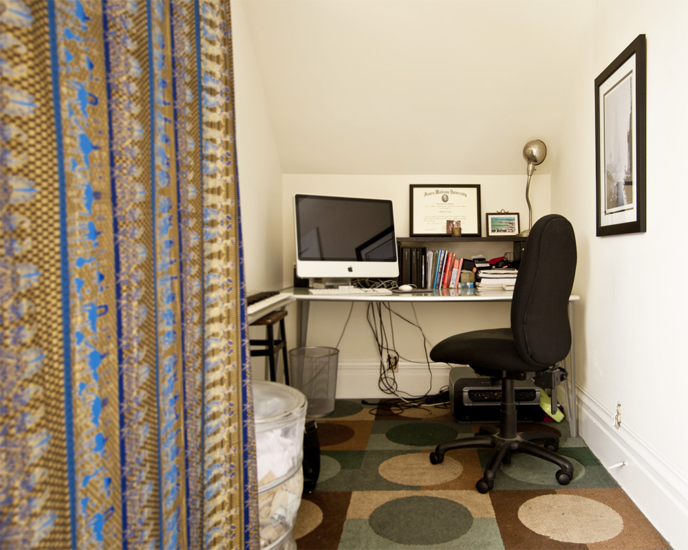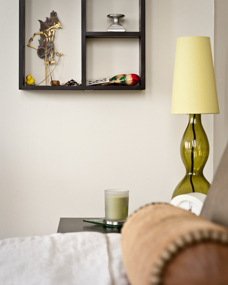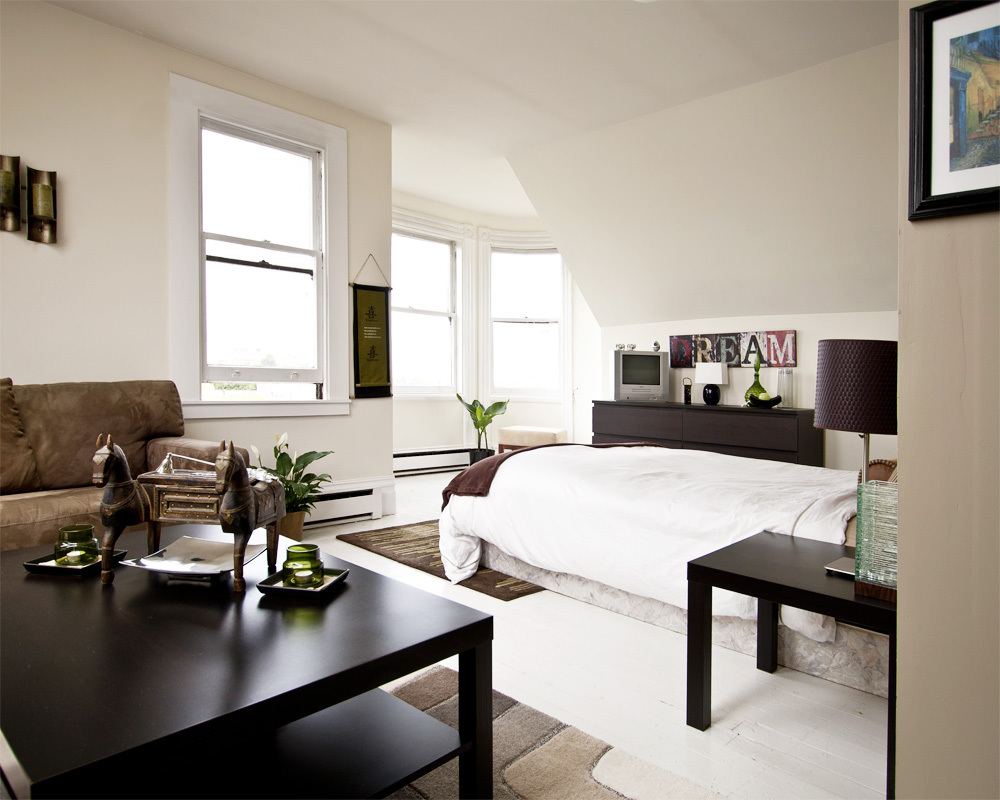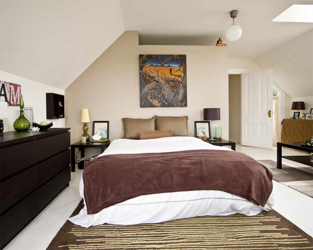 I love earth tones with dark wood accents. With the large skylights and bay windows, this room is always flooded with light. I decided to keep the walls an off white color to give it an open, airy feel. I love travel ling and my room is filled with memorabilia from my trips. Like the rest of the house, my room is a mix of new, borrowed and “found on street” furniture. My favorite part of the room is the view. Although I think I take it for granted sometimes, it definitely influences my mood and outlook on things when I wake up every day.