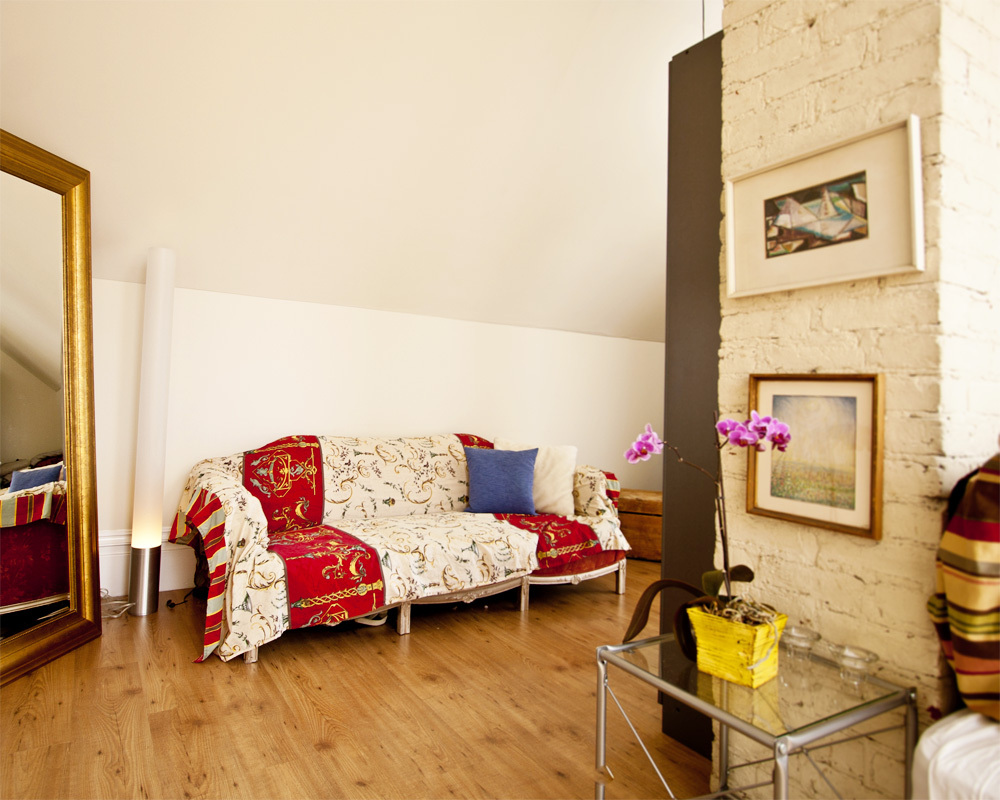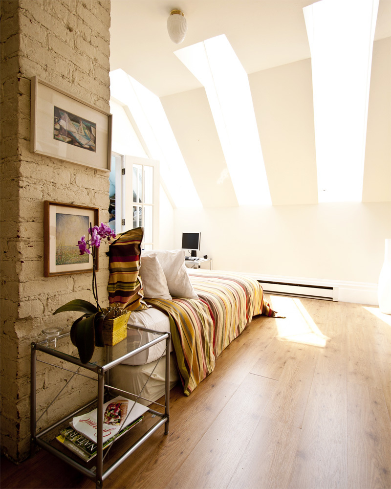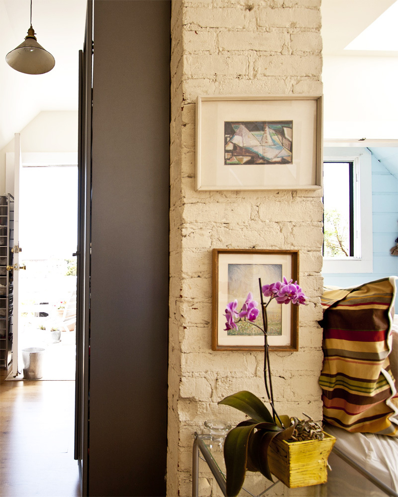 My room is filled with lots of light. From skylights and the adjoining deck. My bedroom is a place where I spend a lot of time, I love its’ simple beauty. It also has to serve a very utilitarian function as it has limited closet space. The art which is dotted about my room is my grandfather’s and it reminds me of what is simple and beautiful about life—sun and flowers and family.