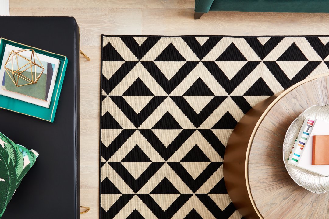 Want to know where the really durable swag is hiding? Outside. Outdoor rugs are affordable and don’t blink at your foot traffic, plus they’re extremely easy to clean. They also come in statement designs that we love: Choosing a geometric rug like the one here—and adding some accents like a tough, lightweight tray and an easy-to-clean faux leather bench—will bring in a whole new look.
