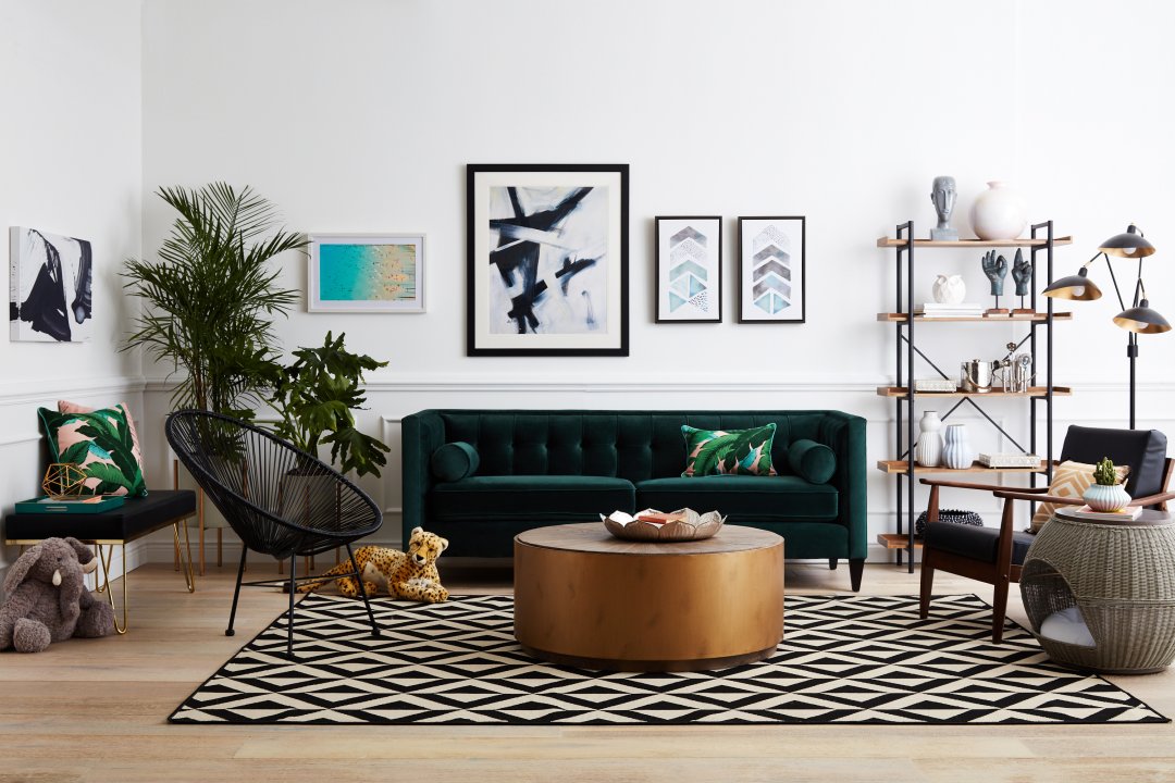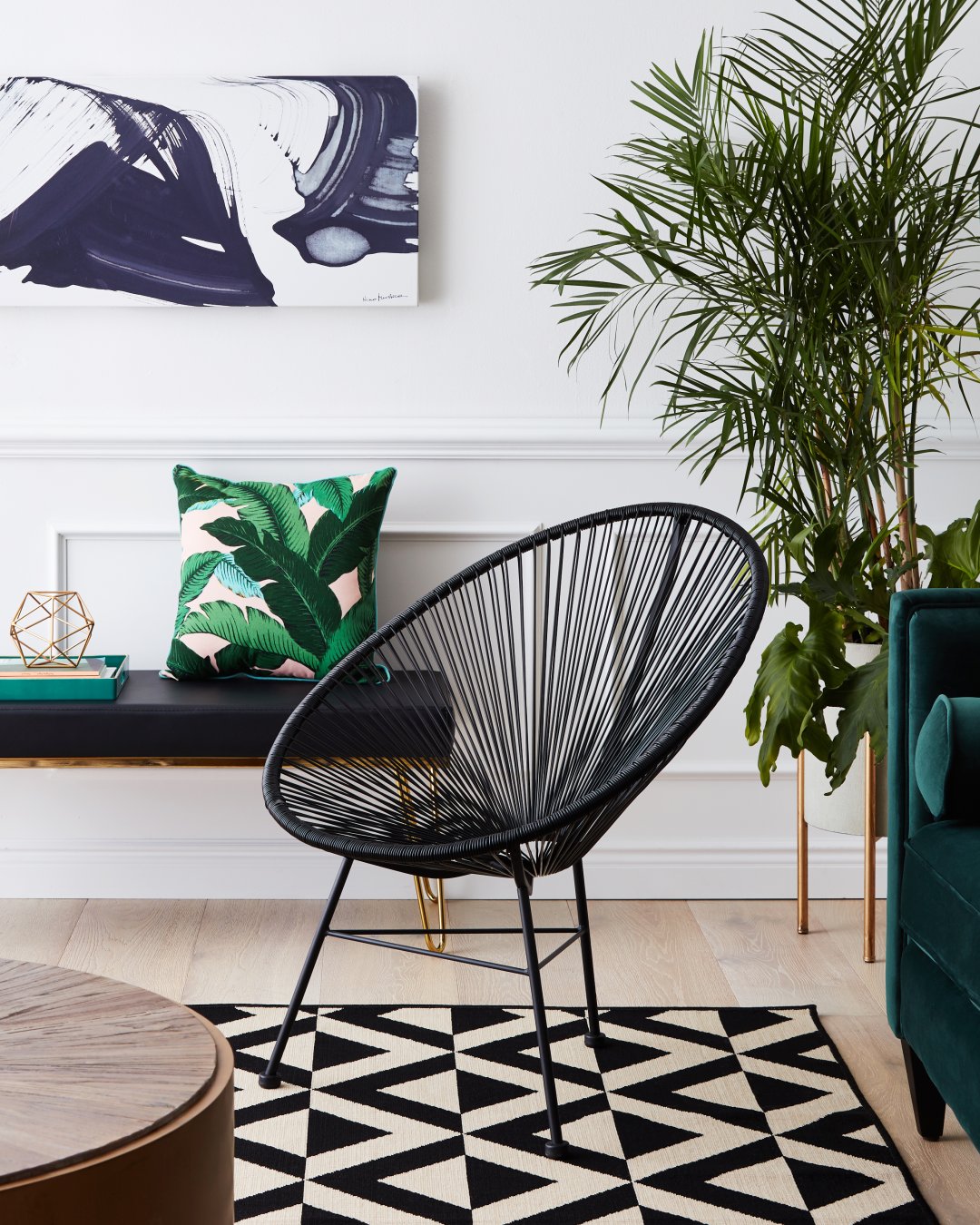 Not every chair or couch needs to be covered in upholstery that you may or may not keep free of red-wine spills. Paired with a plush velvet sofa and a mid-century lounge chair, an Acapulco-inspired wicker chair balances the weight of the room and gives the klutzes a foolproof option. (Remember how easy that rug is to clean?) Chairs with a slighter profile are also a stylish small-space idea that keeps the room feeling light and airy.