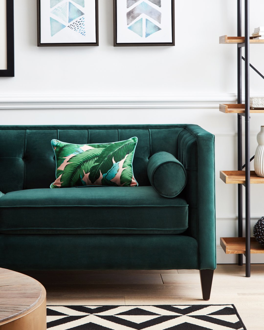 Yes, we’re gonna talk about polyester: Go for a vibrant pattern like these palm print throw pillows, and you’ll get a great print and fade-resistant, long-lasting style. Polyester “velvet” in a rich color, like the Sycamore Green of the sofa, is good at hiding stains and is easy to clean, too. Add a pipe-style bookshelf with industrial vibes, and toughness turns into decor.