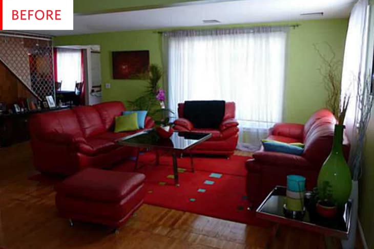 It would be fascinating to meet the person who decided to decorate this living room—in what its new owner described as “the ugliest house I’ve ever seen”—with bright green walls and all red furnishings, but we’ll have to be content with seeing how this Christmas-y space was transformed into a bright, modern, and colorful—but not quite as colorful—room.