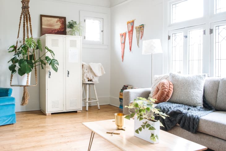 She also incorporated plants and decor on top, but in her living room the lockers help divide the open floor plan space into a living room and dining room, too.