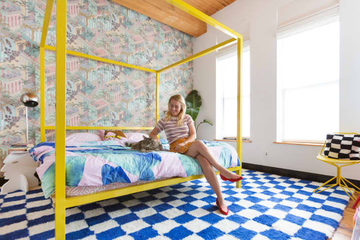 There is charm in mismatched colors in a room, as Aelfie proves in her vibrant bedroom. But part of the reason the clashing colors work is that there is a consistency to the prints she chose: her rug has checkers, and the wallpaper has a boxy feel to it, thanks to the pattern of rooftops printed on it. The bright pop of yellow on the statement bed frame also helps tie the room together.