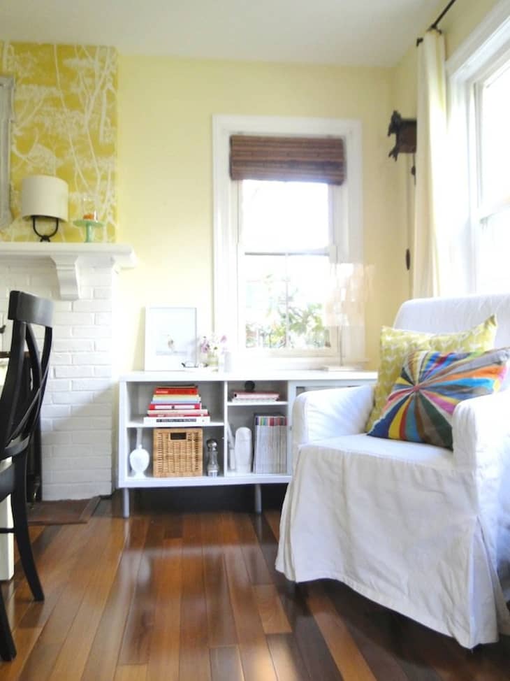 Because we now use all three of our bedrooms for sleeping purposes, our home didn’t have space for an office. We decided to make use of this odd little nook in our family room and added built-in cabinets with space in between for my husband’s grandmother’s nursing school desk. We also added a pop of wallpaper to define the space.