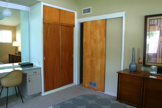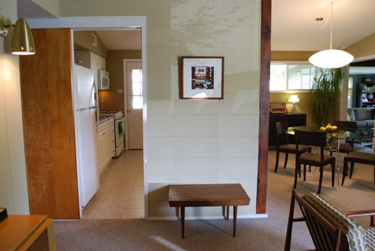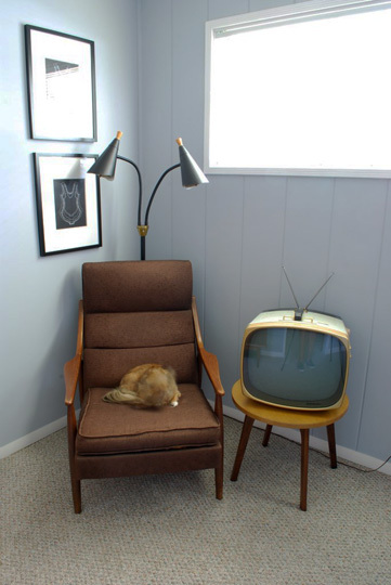 Today, the insides of Ridgewood homes are a mixed bag, with contemporary renovations and “upgrades” ranging in style and quality. Enter Nathan and Hannah, part of a small community of people buying these homes and slowly restoring them to their original modest glory. Instead of adding on, for the past five years the couple has largely taken away, namely coats of of paint covering warm woodwork on sliding doors and ceiling beams throughout the house. They’ve also shown an admirable devotion to finding furniture appropriate in period and/or scale. (If anyone is interested, the leftover spoils of their estate sale and craigslist hunts are listed on Etsy).