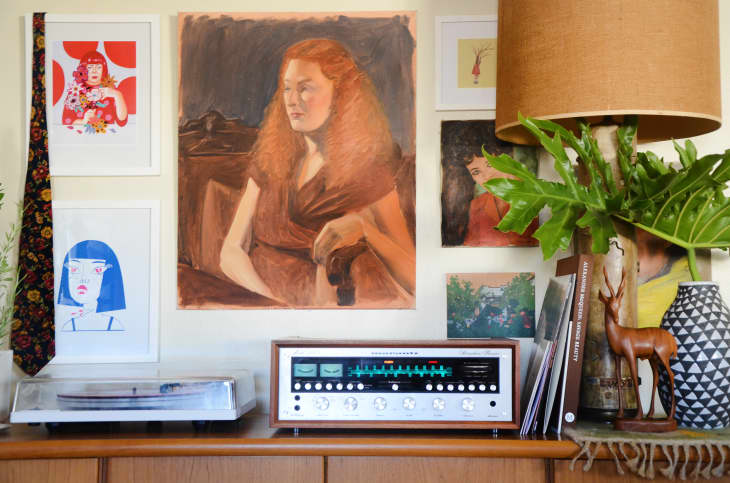 While filling up the rest of your shelf space with records and speakers, adding a gallery wall behind your setup will bring the area to life. Etsy and Society6 have a variety of artists that create posters of musicians that are downloadable, easy to print, and fit perfectly in a frame. For example, pair the latest Harry Styles vinyl with a six-pack set of album-themed posters from Etsy.