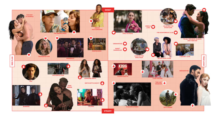 The streamer helped us break down the titles by specific romance genres; between feel-good romantic movies, love and dating reality TV, LGBTQ+ romance, and gal pal TV shows, there’s enough content to keep you occupied until next Valentine’s Day. With a handy image guide (above) that also cross examines the sweet, steamy, red flag (we’re looking at you, Joe Goldberg), and true love narratives, allow this to be the ultimate Netflix Valentine’s guide.
