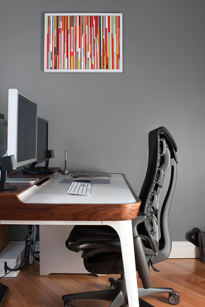 When designing my first home office I knew I wanted to be able to have room to spread out. It was important for me to have a dedicated art table where I could leave things I am working on and a separate area for my digital workstation. This allows me to stay focused on the task at hand and return to the other station exactly where I left off. I had originally planned on building a L shaped desk until I came across a great deal on a, basically new, Herman Miller Aria Desk on Craigs List. This had been my dream desk since its release but far over my budget for a desk. But at over 60% off retail I jumped on it. This was the first real furniture purchase for the office and it influenced the overall (walnut and white) aesthetic a great deal.