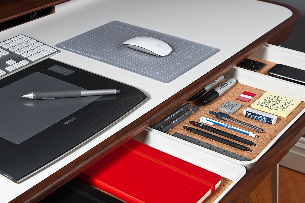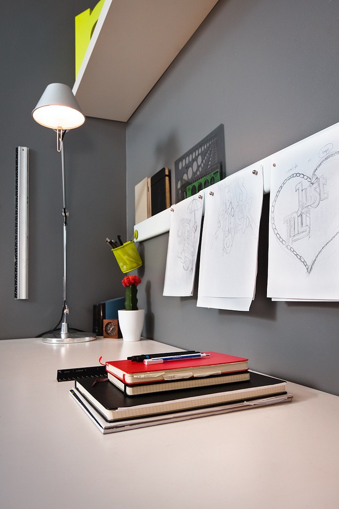 Favorite element in your space: The magnetic strips above the desk I use to hold sketches, inspiration and even supplies has been very helpful. However I’d have to say the double desks because they drastically improved productivity. It’s hard to imagine working any other way now.