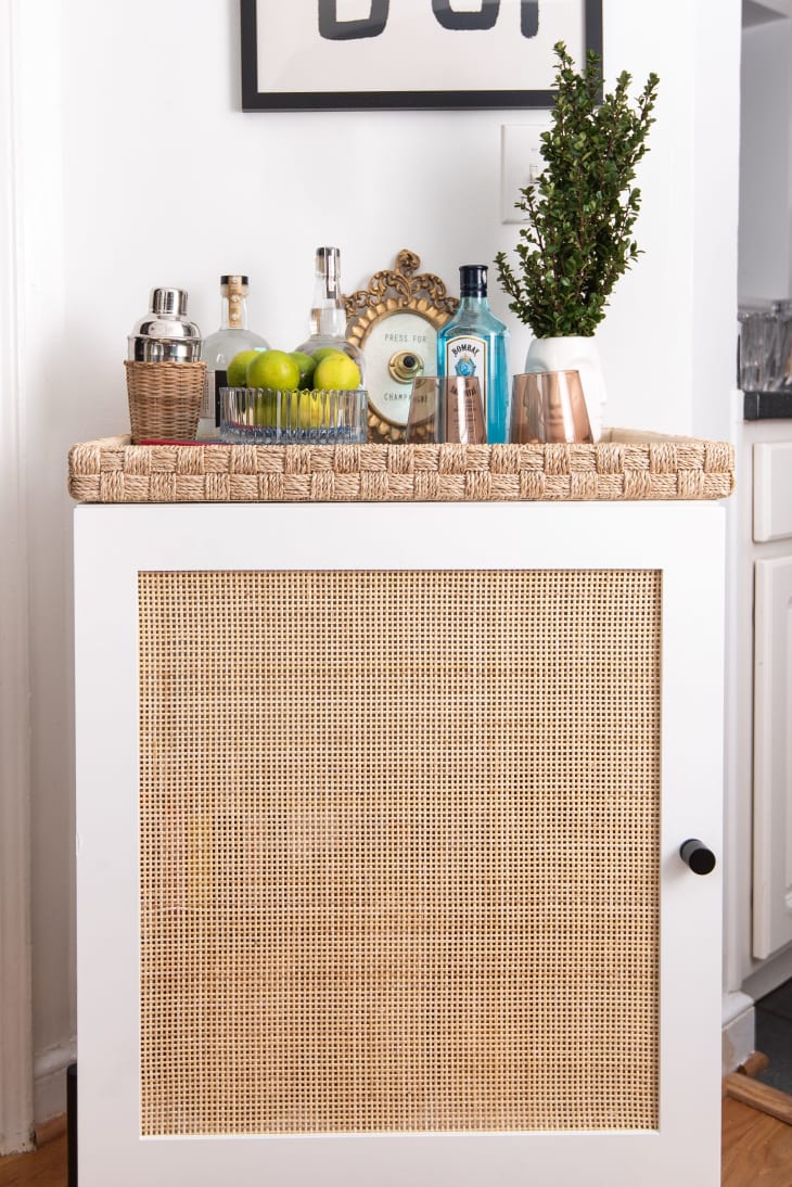 After assembling the IKEA piece (luckily the basic BESTA wasn’t too tricky!), it was time for the exciting part—attaching the cane doors, legs, and knob. Norse provides instructions on how to do all of this, so the process was speedy and straightforward, and I was able to complete the whole thing with the basic tools I have on hand in my apartment. Then came the styling. My favorite oversized tray from Dear Keaton was a must to play up the woven theme—I can’t get enough rattan! It’s the perfect size for this piece, so it almost looks like it’s a built-in part or feature of my BESTA. I rounded out my bar setup with a favorite set of chinoiserie napkins I found on Etsy via Porte Cochere Home.