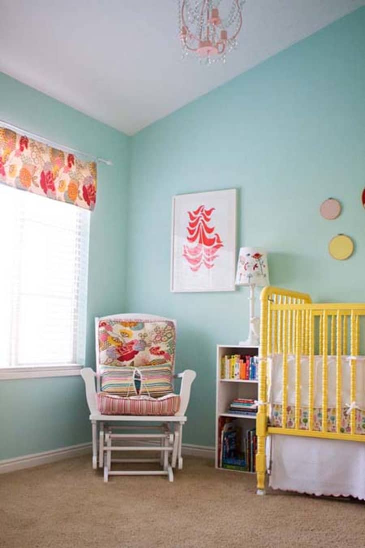 Norah’s mom Caroline says she smiles every time she walks by this room and we can certainly see why. The aquas, yellows, reds, oranges and pinks manage to be both vivid and soothing at the same time to create a feeling of warmth and calm.